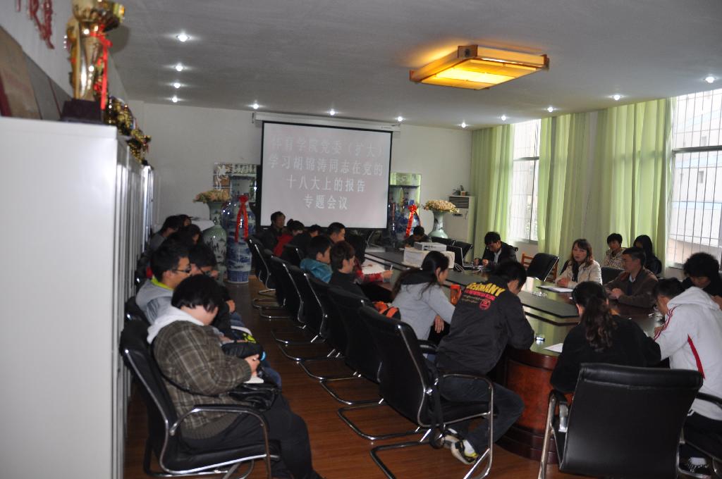 11月9日下午,体育学院在学院二楼会议室召开体育学院党委中心组(扩大)学习胡锦涛同志在党的十八大上的报告专题座谈会,深入学习十八大精神,畅谈学习体会,拉开了学院学习、宣传、贯彻十八大精神的序幕。学院党委委员,学院各党支部书记及委员参加会议。会议由学院党委副书记张礼军主持。