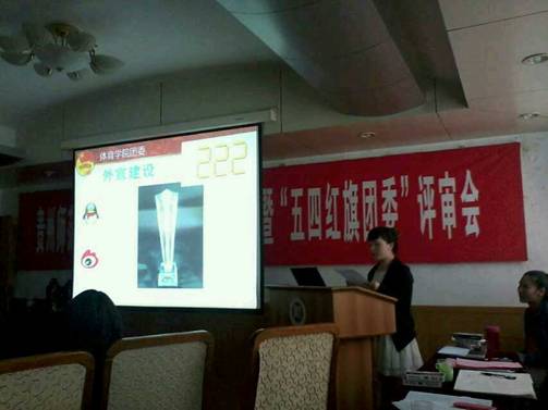 马丽华老师代表院团委作了本学年度工作的精彩汇报,经过激烈的角逐,最终我院获得全校第三名,荣获本学年度“五四红旗团委”称号!