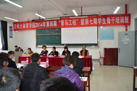 为深入推进“青年马克思主义者培养工程”,在大学生中培养一大批用马克思主义中国化最新成果武装的、有坚定跟党走中国特色社会主义道路理想信念的学生骨干,为他们逐步成长为坚定的马克思主义者奠定基础。体育学院第四期“青马工程”暨第七期学生骨干培训班于2014年11月8日早上举行开班典礼,莅临现场的领导有贵州师范大学组织部副部长、校党校常务副校长彭洁、体育学院党委书记路言莉、副院长王瑛、徐宏及各年级辅导员等,参会对象由学院团委、学生会、青分会及各年级各班全体学生干部180多人组成,开班典礼由学院团委书记马丽华主持。