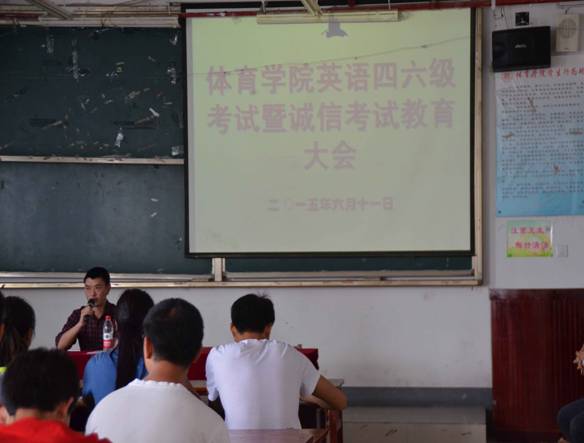 为了加强英语四六级诚信考试教育,2015年6月11日中午12:30,体育学院党委副书记张礼军老师在综合大楼8—4召开了体育学院英语四六级诚信考试教育动员大会。张礼军副书记从考生须知、违规行为认定及注意事项等方面做了整体介绍,强调并要求全院参加四六级考试的同学必须诚信参考。