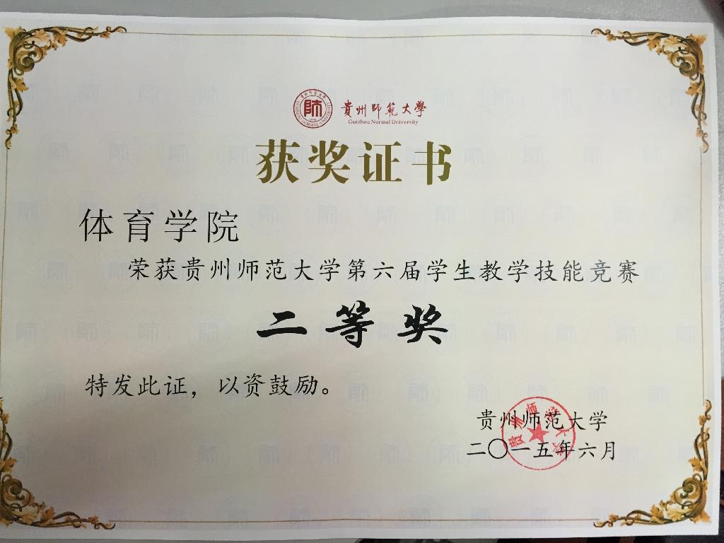 在2015年6月所举办的贵州师范大学第六届学生教学技能竞赛中,体育学院发挥出色,张胜龙、张琨、付贤清等76人次人荣获一等奖,雷晓华、徐正飞、陈坤银等36人次荣获二等奖,另有两人获得三等奖。彭佐扬、吴燕、彭红阳三人当选优秀指导教师。同时,体育学院荣获集体二等奖。