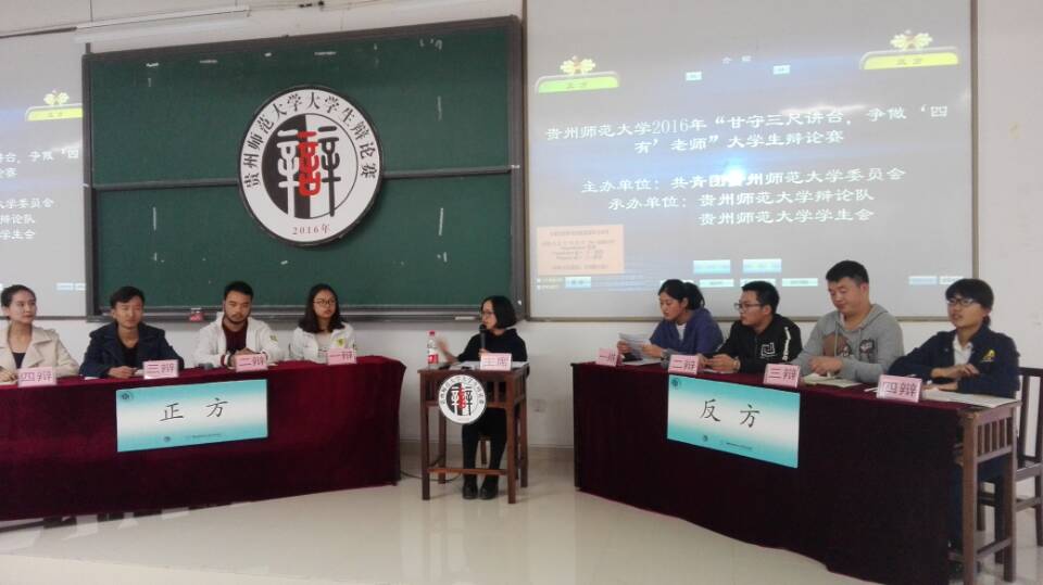 2016年10月9日下午14:30在贵州师范大学花溪校区公共教学楼6教3楼举行了一场非常激烈的辩论赛,正反双方围绕关于“是否应当加大中小学教育中文言文的比例问题”分别阐述了本方的观点。正方认为应当加大比例,反方则否认这一观点。令人眼前一亮的是,正反双方分别是文学院和体育学院,他们针锋相对,在短短二十分内,来自体育学院的反方代表通过举例子、作对比等多种方式以绝对优势赢了来自文学院的正方代表。可见体育学院的代表们做好了各方面的充分准备,辩论赛当场竞争激烈、氛围良好;反方一辩更是获得了“最佳辩手”的荣誉称号。学校通过这种独特的学习方法让同学们在轻松的环境中学会了关注中国的教育方式,对国家的教育制度更加了解,最后辩论赛取得了圆满成功。