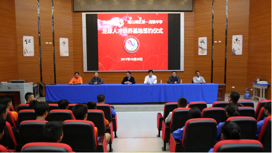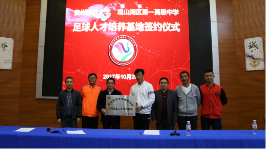 为积极贯彻落实国家发改委、体育总局、教育部等四部委联合下发的《关于印发中国足球中长期发展规划(2016-2050年)的通知》以及省委、省政府要求积极推进校园足球建设的精神,为强化校园足球建设,普及发展足球运动,改进足球专业人才培养发展模式,积极推进足球后备人才的选拔、培养和深造,探索校园足球发展的新模式, 在学院已和深圳宝安体校、山西孝义五中、都匀一中等足球后备人才基地的基础上,2017年10月20日,体育学院党委书记蒙黎明、院长姚鑫、院办主任杨中兵以及校园足球专家骆传武、曹波等一行前往贵州省校园足球特色示范学校观山湖一中就足球后备人才基地建设等相关工作进行了座谈和基地签约挂牌工作。