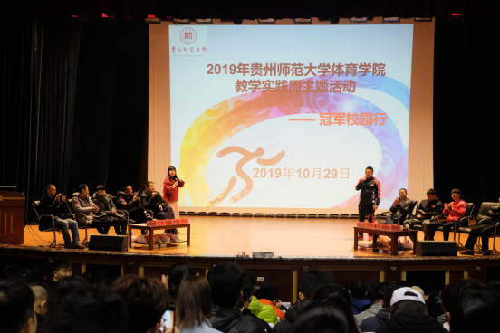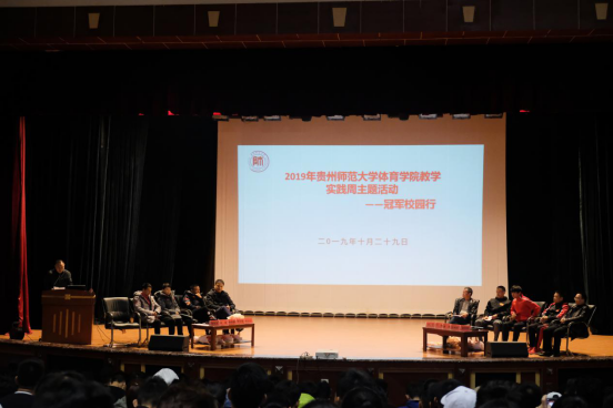 10月29日上午,体院学院在宝山校区大礼堂开展教学实践活动周——冠军校园行活动。贵州省体育局体育工作大队党委书记杨子,贵州省体育局体育工作大队副大队长甘小川,拳击国家级教练员刘杨海,贵州省田径队主教练李长忠,世界冠军、亚锦赛冠军、全国冠军骆淳、严伟、徐诗琪、张果,体育学院党委书记蒙黎明、副院长曾晓进、院党委副书记吕涛、副处级组织员孟忠常等领导及嘉宾出席。学院全体学生和部分教师参加活动。副院长杨中兵主持。