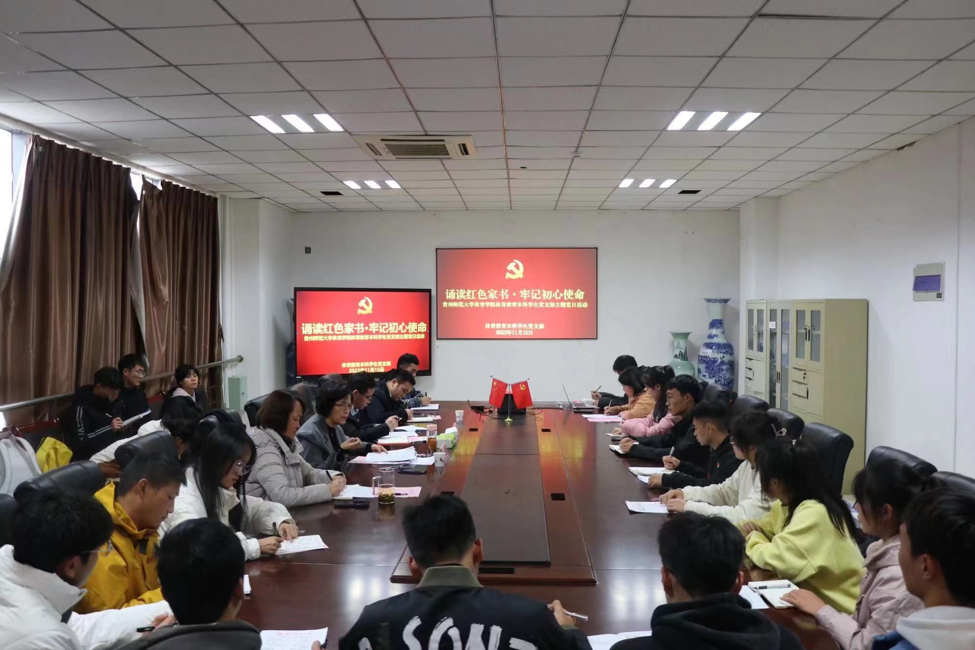 会议伊始,张雪雷介绍了体育教育本科学生党支部的基本情况。随后,支部党员、发展对象饱含深情地诵读了《习近平写给父亲的一封家书》、《陈觉给妻子的家书》、《曾志遗书》、《赵一曼给儿子的家书》、《冼星海给妈妈的家书》、方志敏《可爱的中国》节选,并一起聆听了《读一读红色家书》歌曲。支部党员吴元飞、罗栋等党员进行了交流发言。