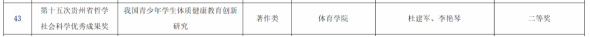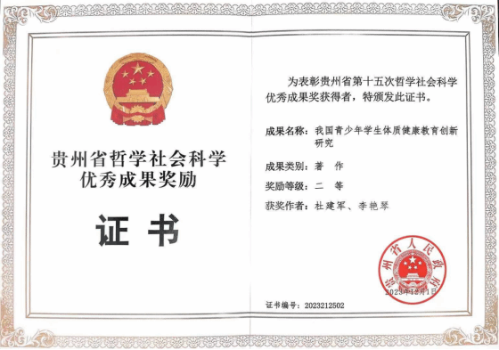 12月7日,贵州省第十四次、十五次哲学社会科学优秀成果奖颁奖大会在贵州省委大会堂举行,我院杜建军老师团队的著作《我国青少年学生体质健康教育创新研究》荣获第十五次哲学社会科学优秀成果二等奖。