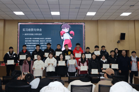 最后,杨中兵副院长宣读了体育学院2021级优秀实习学生名单,并颁发荣誉证书。杨院长充分肯定了实习生们取得的进步,并对实习指导老师们的辛勤付出表达了感谢。他强调实习只是同学们职业生涯开始前的一次演练,实习工作的结束并不代表同学们可以止步不前,而是步入职业新征程的开端。他激励同学们树立远大理想,继续践行“修身、明志、立德、铸魂”的院训,以教育家精神为指引,以“四有”好老师为标准,在教育实践的新征程中争做新时代的运动家、体育家,用实际行动诠释体育的精神内涵,展现师大体院学子的风采。