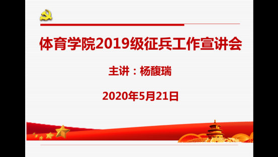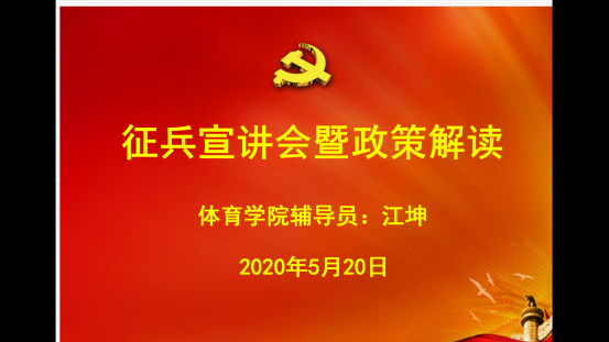 5月20日晚上,体育学院辅导员江坤老师运用腾讯会议APP,给体育学院毕业生和低年级男生作了一次征兵工作宣讲,给同学们讲解了当兵的条件、工作流程,以及国家和学校的相关优惠政策。