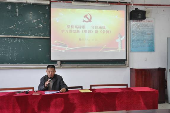 为贯彻落实新修订的《中国共产党廉洁自律准则》、《中国共产党纪律处分条例》,深入推进党风廉政建设,根据中共贵州省委办公厅《关于认真学习贯彻〈中国共产党廉洁自律准则〉和〈中国共产党纪律处分条例〉的通知》和校党委《中共贵州师范大学委员会关于开展〈中国共产党廉洁自律准则〉和〈中国共产党纪律处分条例〉学习宣传活动的实施方案》的通知精神,3月18日下午,体育学院在综合楼8-4举行了学习《中国共产党廉洁自律准则》、《中国共产党纪律处分条例》专题党课,体育学院全体教师党员及学生党员代表参会。