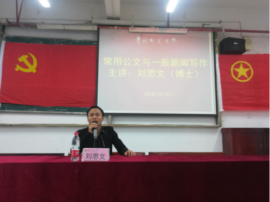 3月31日晚,贵州师范大学文学院副教授刘思文老师应邀为我院学生干部作了一场题为《常用公文与一般新闻写作》专题讲座,对这些问题作了一一解答。此次讲座也是我院“青年学习讲堂”的第二讲。