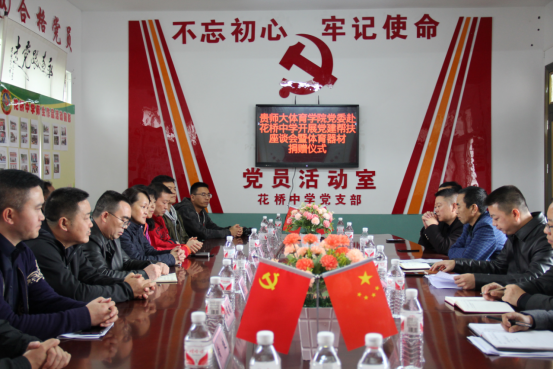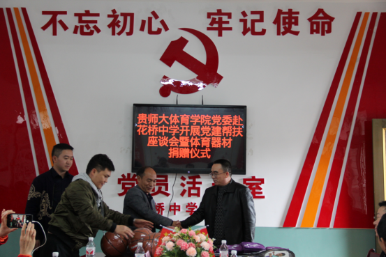 在花桥镇初级中学召开的党建帮扶座谈会上,花桥镇党委书记刘松整体介绍了花桥镇决战决胜脱贫攻坚工作的整体情况,副镇长周正军介绍了花桥镇教育扶贫的有关工作,副镇长兼周家湾村党支部书记梁昕介绍了周家湾村脱贫攻坚一线战场的具体工作情况,花桥镇初级中学校长汪再军介绍了学校推动落实教育精准扶贫情况和中学体育教育情况。随后,体育学院党委书记蒙黎明做交流发言,他首先代表学院党委向长期奋战在花桥镇脱贫攻坚一线的广大党员干部表示崇高的敬意;提出学院党委高度重视党建结对帮扶工作,将会结合当地现有资源,依托学院专业学科优势和社会资源制定出切实有效的帮扶措施,助力当地决战决胜脱贫攻坚,推动实施乡村振兴;同时希望双方通过党建结对帮扶,鼓足战胜贫困的斗志和勇气,带领当地群众巩固脱贫攻坚工作成果,在新时代继续奋力拼搏。最后蒙黎明代表体育学院为花桥镇初级中学捐赠了篮球、乒乓球、羽毛球等价值4千多元的体育器材。