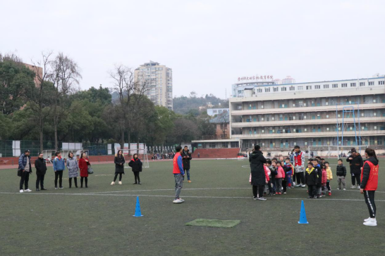 集中学习后,师生党员到田径场开展幼儿体育帮扶活动。前期,学生党员们、入党积极分子们在教师党员的指导下,认真准备了足球、篮球、体操和武术四个项目的游戏方案与器材。15点30分,师大幼儿园大班70余名小朋友到达田径场,分成四个小组,依次轮换参加足球、篮球、体操、武术四个项目小组的游戏体验。