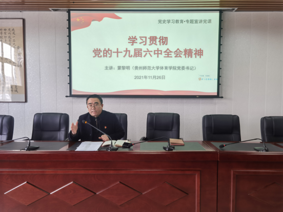 11月26日,体育学院在宝山校区综合大楼8-4召开教职工政治学习会议,学院党委书记蒙黎明宣讲了党的十九届六中全会精神,院长曾晓进、院党委副书记吕涛、副院长杨中兵和全院教职工参加。