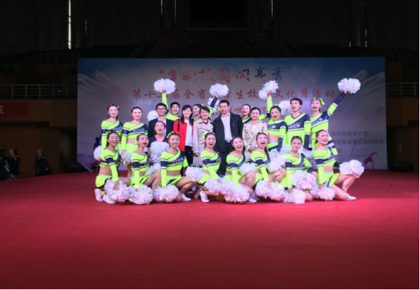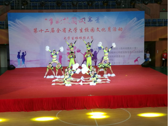 为加强和改进大学生思想政治教育工作,展现当代大学生健康向上的精神面貌和青春风采。10月28日下午,由省教育厅、省文明委和团省委主办的“多彩校园,闪亮青春”第十二届全省大学生校园文化月活动大学生啦啦操大赛在贵阳学院举行。教育厅赵廷昌等领导出席,我校参赛队由体育学院组织选拔18名队员参加决赛,院党委副书记吕涛、团委书记彭佐扬及教练李政、宋方芳、赵贡美等老师带队。