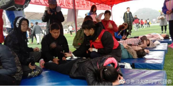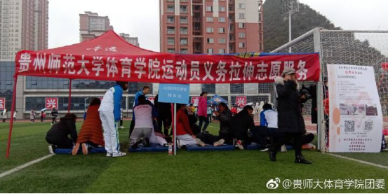 11月7日至9日,贵州师范大学体育文化艺术节在花溪校区田径场举行。为提高运动员竞技状态、避免运动后造成运动损伤,由体育学院学生党务工作中心、团委、学生会、青分会学生干部组成的志愿者服务队,在足球场终端设了义务拉伸志愿服务工作点,开展义务拉伸志愿服务活动。