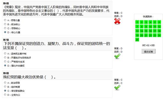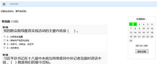 在进行试卷竞赛的时候,选择好后,右边的导航会标记为绿色。用鼠标点击相应的题号,可以快速到达此题。