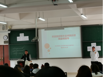 当天接着邀请了贵州省体工大队全国冠军骆淳、严伟在宝山校区音乐大厅给同学们做了“冠军运动员成长分享”专题讲座,邀请了贵州恒丰足球俱乐部预备队主教练、前中国国家队队员、中国足协教练员讲师、A级教练员韩金明在花溪校区给足球专业同学开展了“中国青少年足球教练的职责”专题讲座。