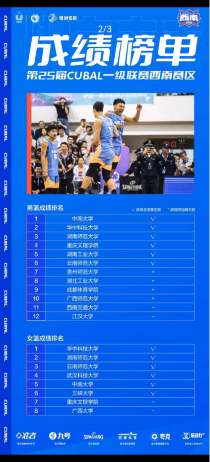 3月26日,第25届CUBAL联赛西南赛区在云南财经大学圆满落下帷幕。我校男篮八进四阶段加时赛2分惜败上届全国八强重庆文理学院后,排位赛以91:83战胜湖北工业大学,最终获第七名和体育道德风尚奖运动队,球员付泳畅获赛区得分王、单场得分王称号。