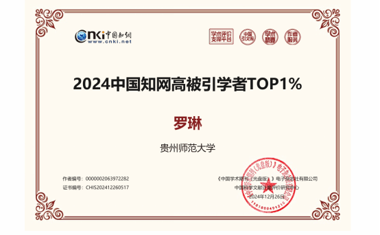 近日,由中国知网中国科学文献计量评价研究中心(简称“知网评价中心”)主办的“2024年中国知网高被引学者”研制报告发布会在北京举行。会上正式发布了《“2024年中国知网高被引学者”研制报告》,并公布了入选名单。经过客观、严谨的评价程序,我院罗琳教授成功进入“2024中国知网高被引学者TOP 1%”行列。